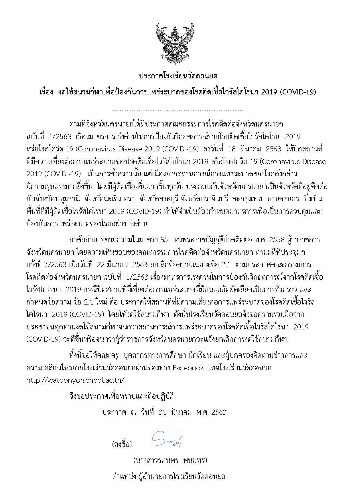 ขอความร่วมมือในการงดใช้สนามกีฬาโรงเรียนวัดดอนยอ เพื่อป้องกันการแพร่ระบาดของเชื้อไวรัสโคโรน่า 2019 (COVID-19) อาศัยประกาศของผู้ว่าราชการจังหวัดนครนายกในการกำหนดมาตรการการป้องกันการแพร่ระบาดของเชื้อไวรัสโคโรน่า โดยของดใช้สนามกีฬาตั้งแต่บัดนี้เป็นต้นไปจนกว่าสถานการณ์จะดีขึ้นหรือจนกว่าผู้ว่าราชการจังหวัดนครนายกจะแจ้งเปลี่ยนแปลง